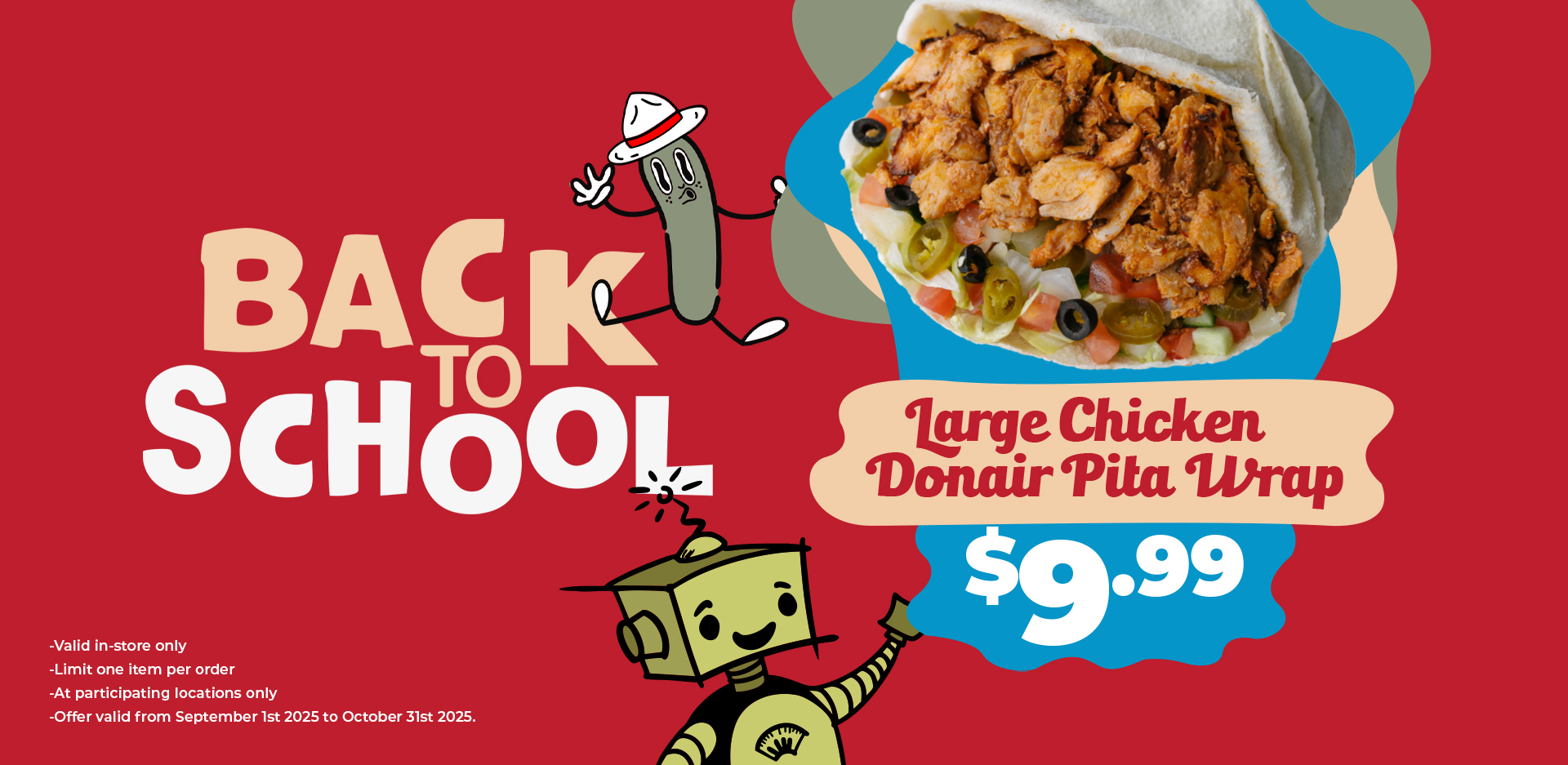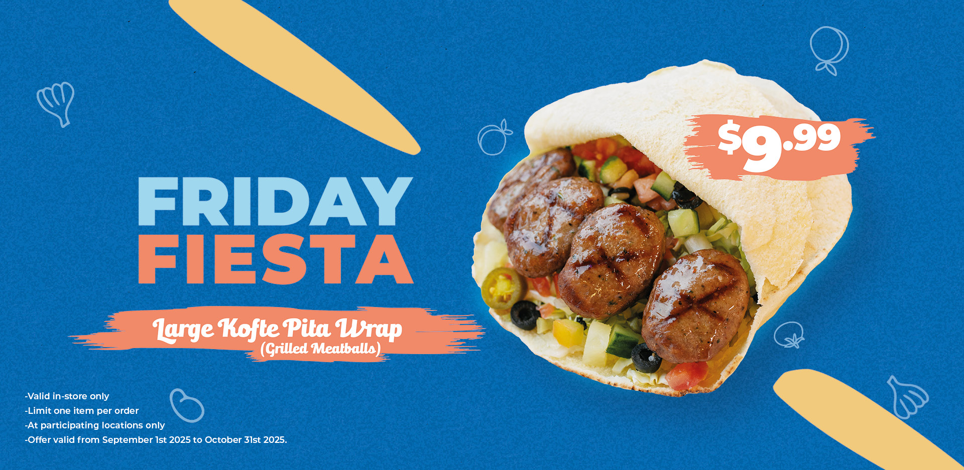 We are proud to offer delicious and healthy menu. Our ingredients are always freshly prepared, our meat comes from premium farms in British Columbia and slowly roasted to perfection. Our pitas, tortillas and rice dishes are made with only the highest quality ingredients.